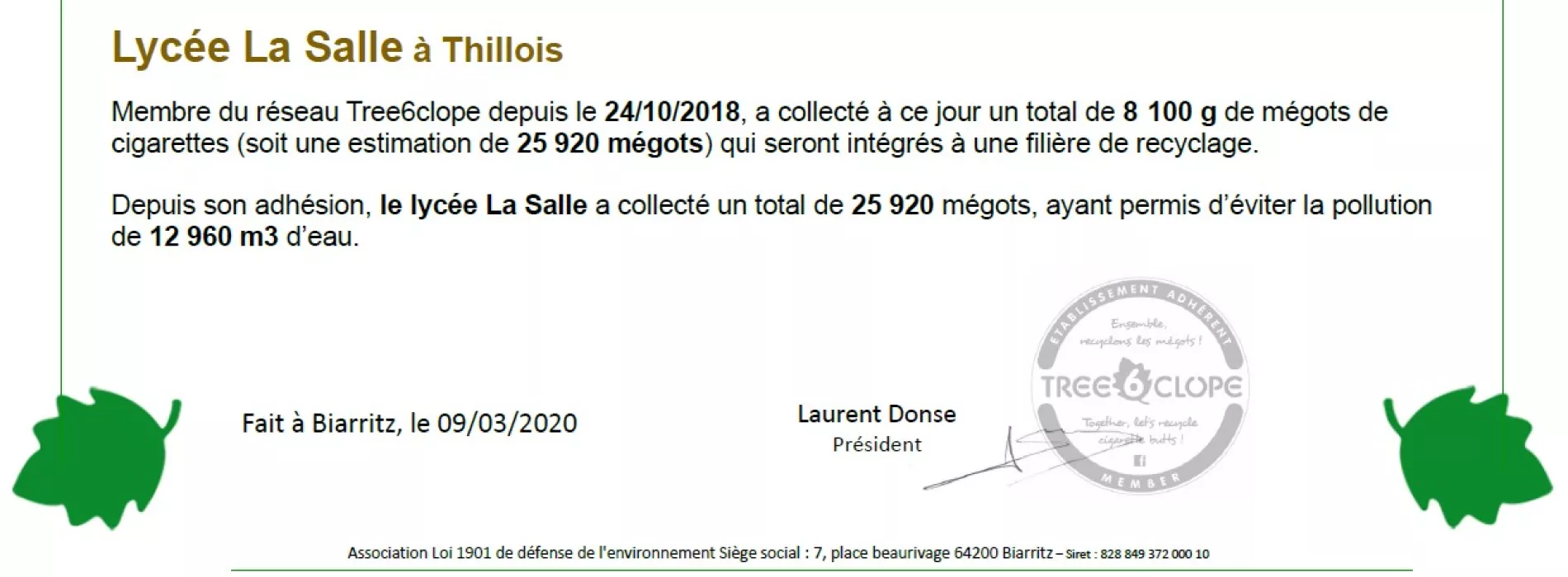 Membre du réseau Tree6clope, nous participons depuis 2018 à une collecte de mégots afin qu'ils puissent être recyclés.