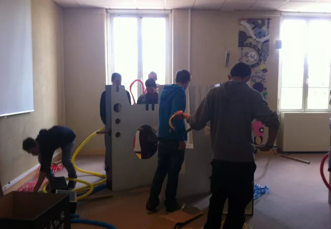 Le matin, nous avons investi l'espace Expositions du Salon : les élèves se sont prêtés au "Jeu des sculptures" (l'artiste Hervé Tullet proposait une quantité de formes simples à manipuler, ainsi qu'une structure réalisée par des enfants de Tinqueux grâce à des matériaux de récupération), cette séance "création" ludique fut suivie d'une séance improvisée avec l'illustrateur Laurent Audouin, qui nous a présenté de manière très interactive les coulisses d'un album. Un échange très enrichissant !
