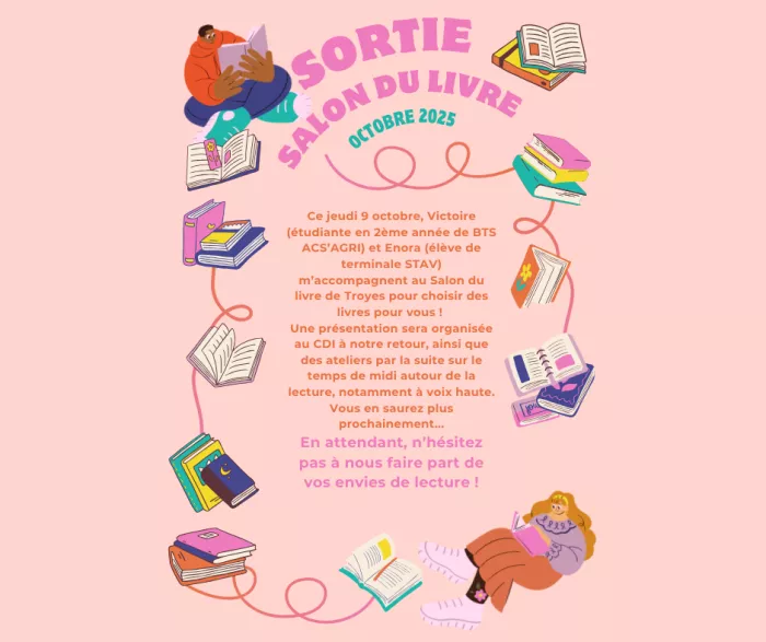 📌 Victoire (étudiante en 2ème année de BTS ACS’AGRI), Enora (élève de terminale STAV) et Julian (ancien stagiaire en documentation) m’ont accompagné au Salon du livre pour choisir des ouvrages pour le CDI !