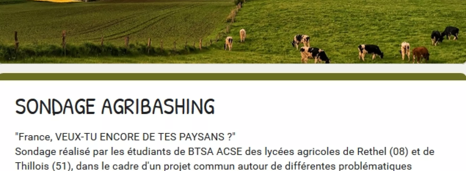 "France, VEUX-TU ENCORE DE TES PAYSANS ?" Sondage réalisé par les étudiants de BTSA ACSE des lycées agricoles de Rethel (08) et de Thillois, dans le cadre d'un projet commun autour de différentes problématiques actuelles (exploitants en détresse, bien-être animal vu par les consommateurs, polémique glyphosate, vision des médias, réchauffement climatique, pression du bio, incompréhension riverains / exploitants agricoles...).