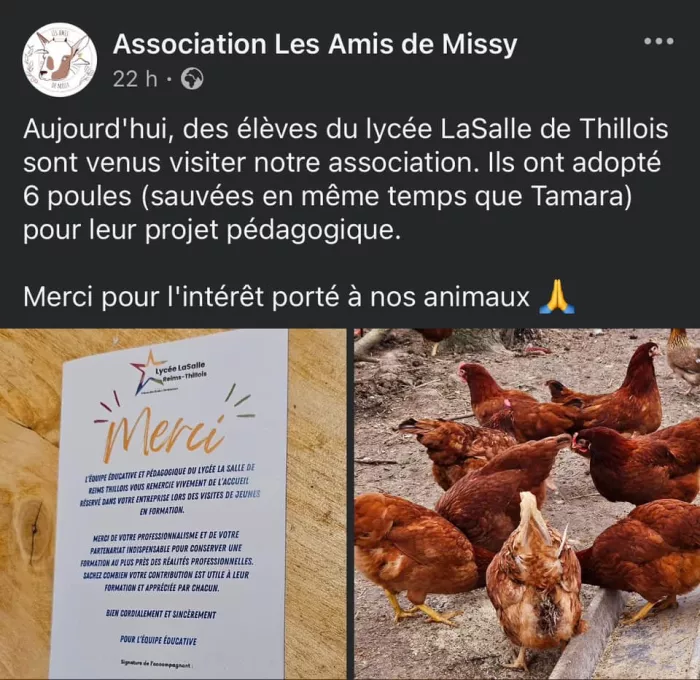 Mardi 12 mars 2025 - Mathis, Adrien, Louis et Edgar (Ă©lĂšves de 2nde GT) ainsi que Mme Lefebvre sont allĂ©s chercher des poules rousses issues dâun sauvetage. Elles vivaient dans des conditions insalubres et ont Ă©tĂ© saisies sur dĂ©cision judiciaire. GrĂące Ă l'Association Les Amis de Missy, nous leur offrons une nouvelle vie ! Nous les remercions pour leur confiance.