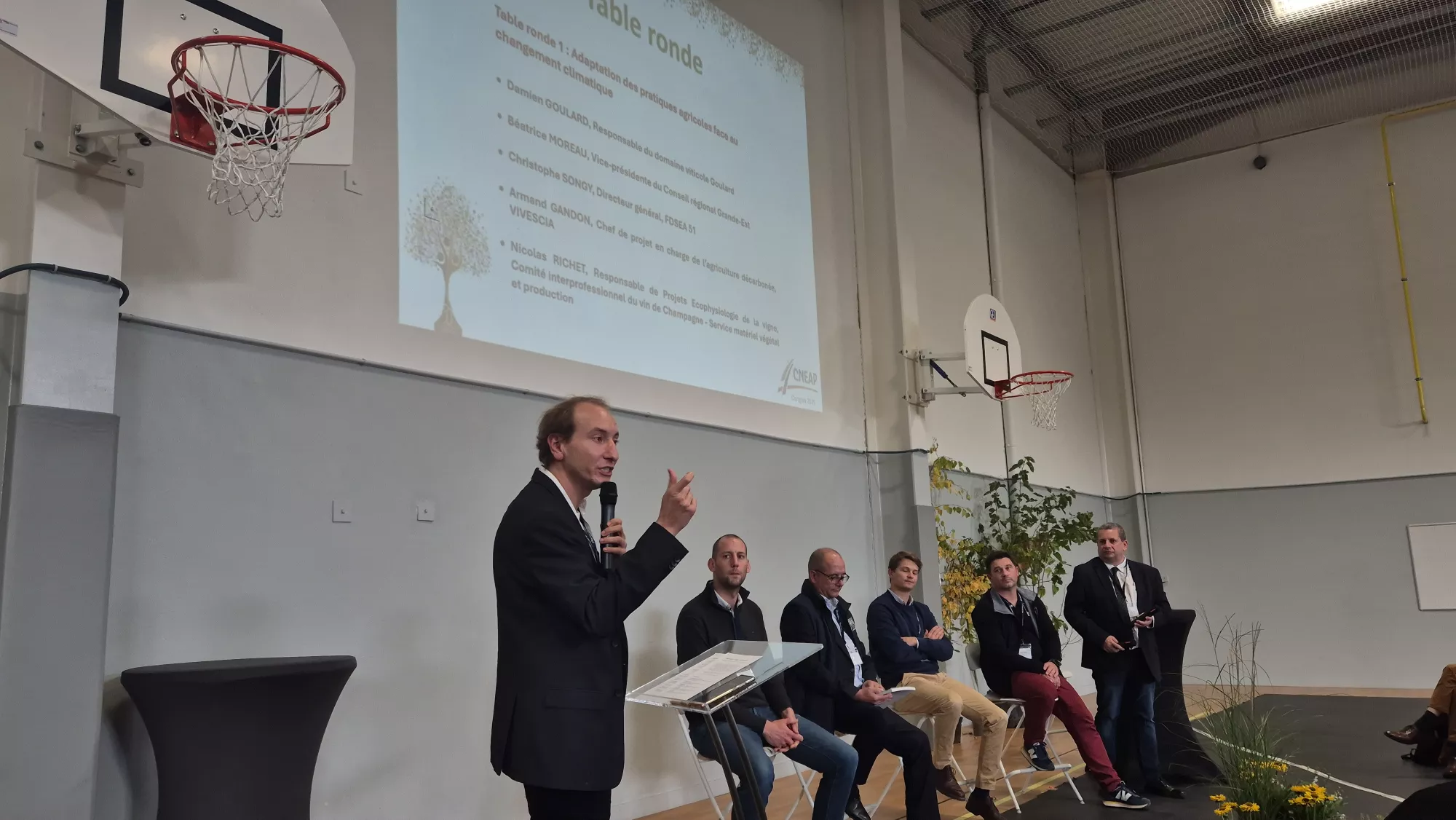 Merci aux intervenants de la 1ère table ronde "Adaptation des pratiques agricoles face aux changements climatiques" : Jean-Marie Goulard, viticulteur ; Christophe Songy, directeur général FDSEA 51 ; Arman Gandon, chargé de projet décarbonisation à VIVESCIA et Nicolas Richet représentant le Comité Interprofessionnel du Vin de Champagne.