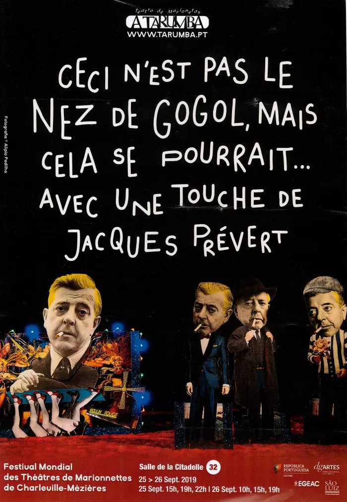 Le spectacle que nous avons choisi de vous présenter s’appelle Ceci n’est pas le nez de Gogol, mais cela se pourrait. C’est la compagnie portugaise, originaire de Lisbonne, A Tarumba – Teatro de Marionetas, qui présente ce spectacle. Les techniques utilisées sont le théâtre d’objets et de papier.